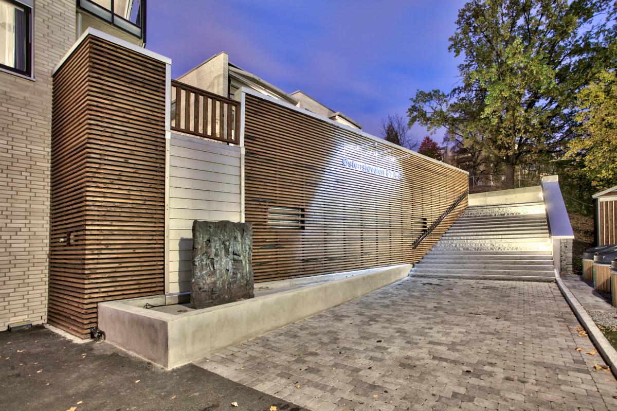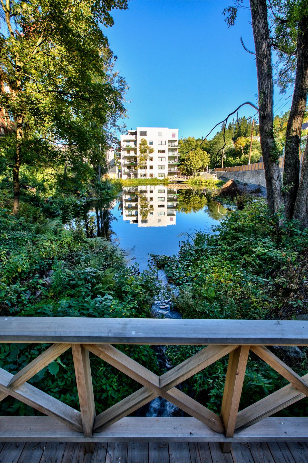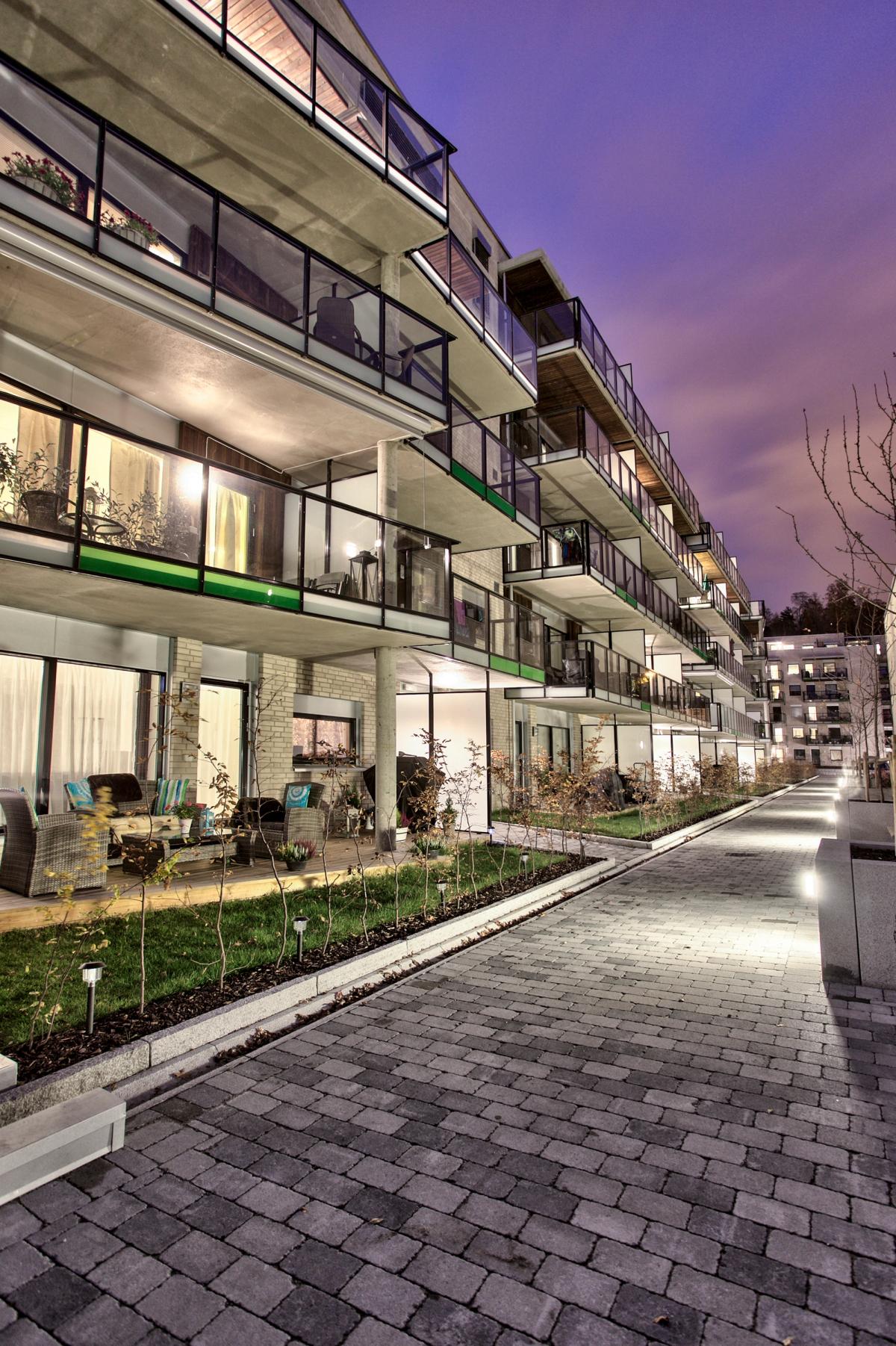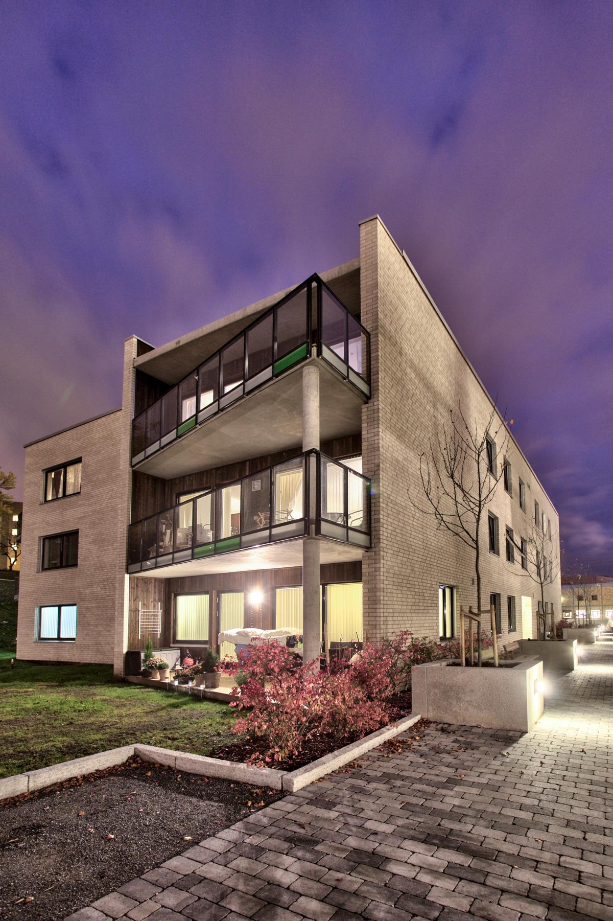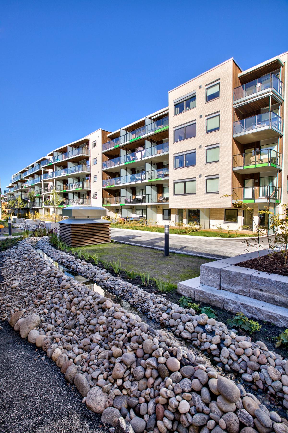 Det største volumet, Bekkhuset, danner en motvekt til kollen i sør slik at det sammen med øvrige bygg omkranser et indre grønt rom. Det høyere Damhuset speiler seg i dammen og er et fondmotiv internt i gårdsrommet. Det lave Hagehuset fungerer som gårdsrommets avslutning mot vest. Den antikvariske «gule stuen» er restaurert og fungerer som et felleshus for boligene.