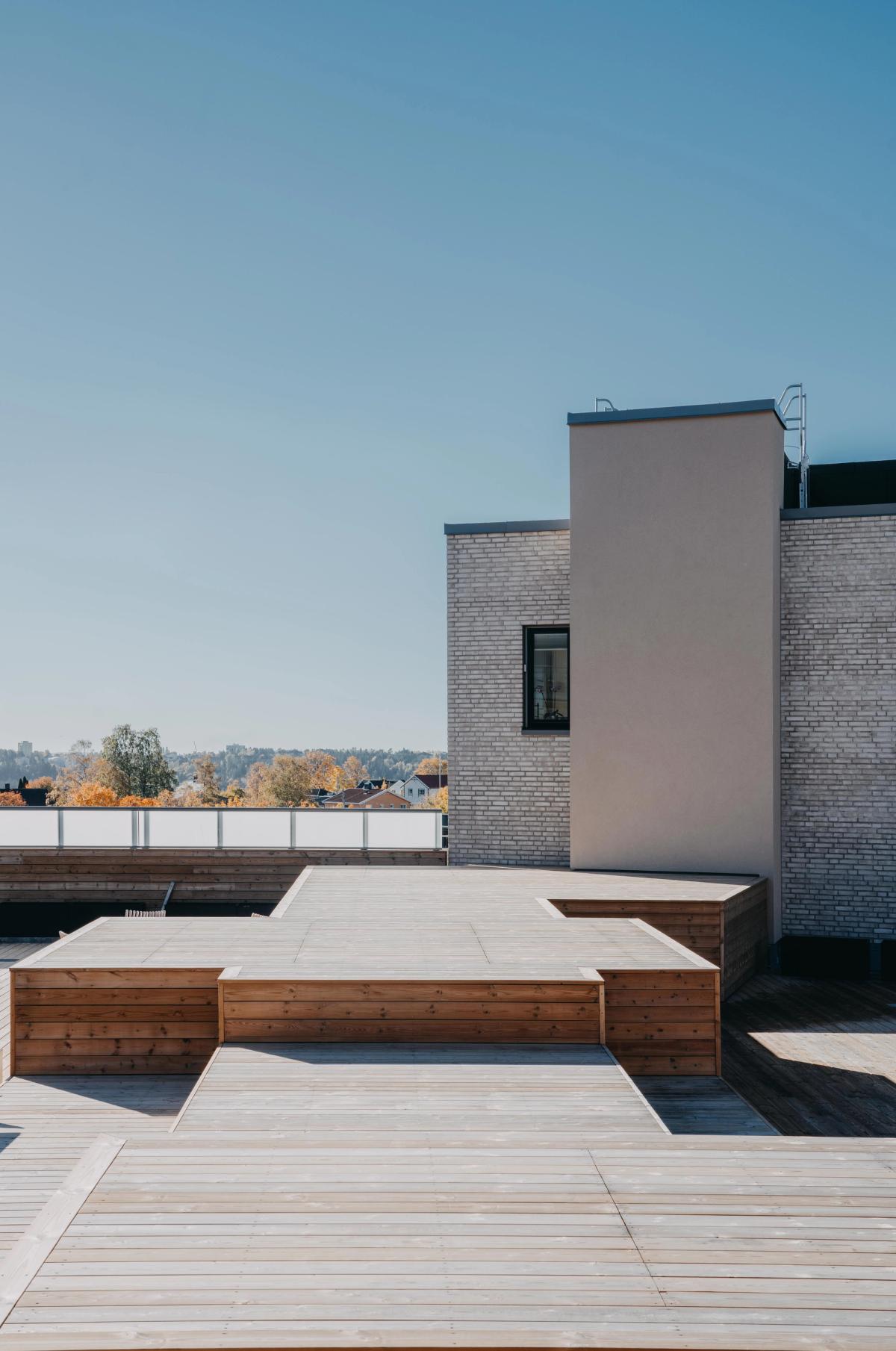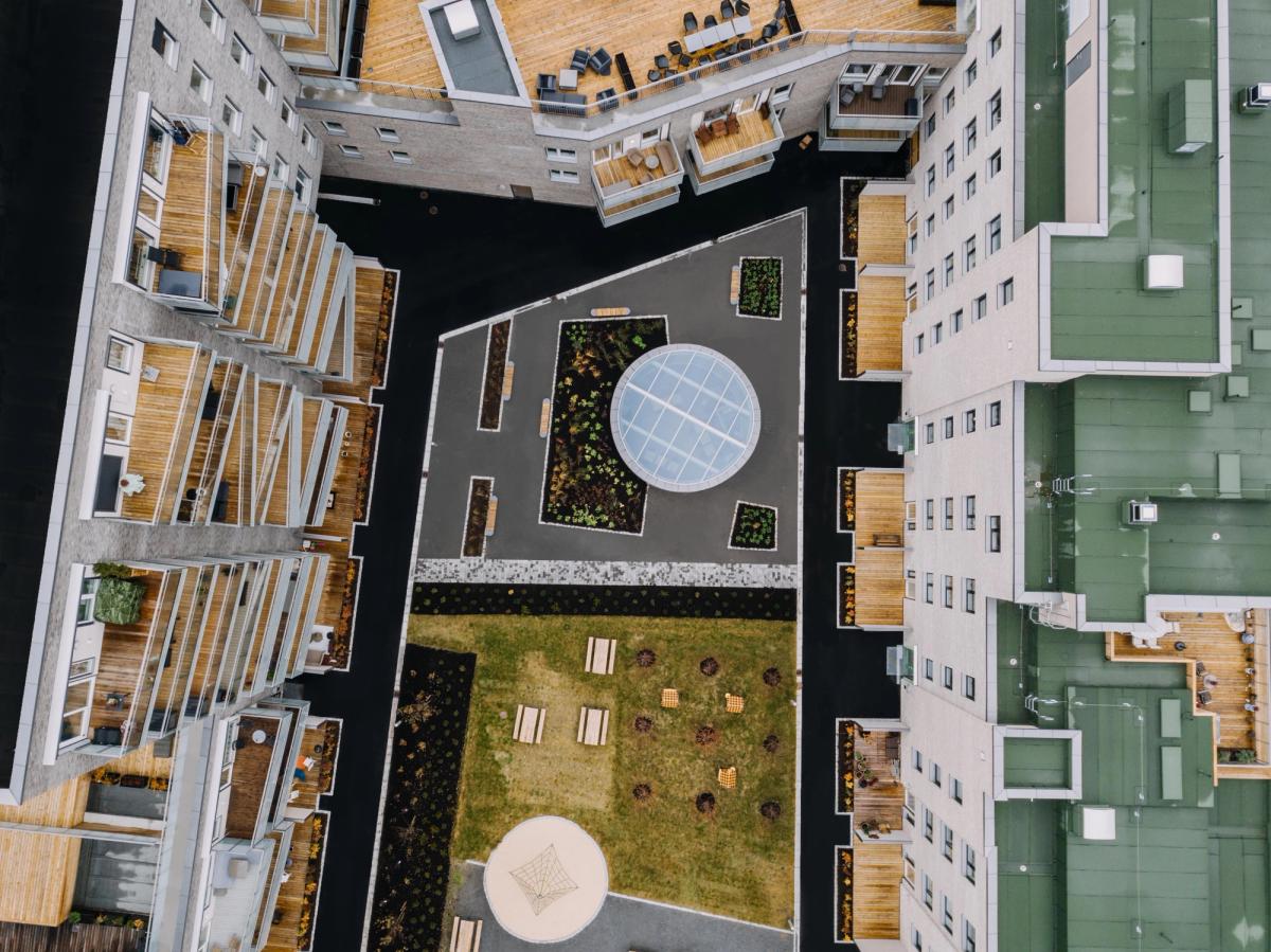 De fleste av boligene omkranser et stort gårdsrom beplantet og møblert for lek og opphold. I tillegg finnes det flere felles takterrasser.