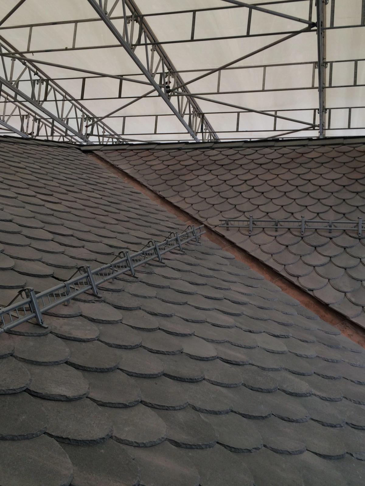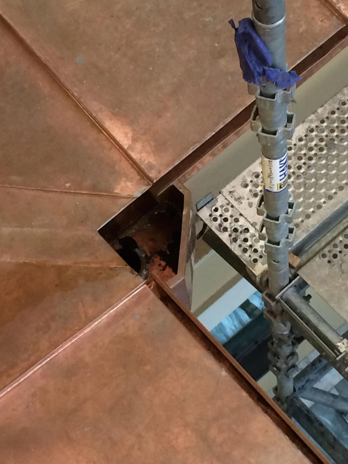 Taket var i svært dårlig forfatning med mange midlertidige reparasjoner og med fare for nedfall av skifer ned på fortau. Rehabiliteringen har omfattet utbedring av råteskader i takkonstruksjonen, omlegging av skifertaket. Alle blikkenslagerarbeider som ny falset tekking, beslag, renner og nedløp er utført i kobber. En rekke nyere vinduer og overlyskupler på taket er fjernet, vinduer i fasaden er istandsatt og malt, fasaden er vasket, dårlig murstein er skiftet ut og det er utført steinreparasjoner på fasadeelementer i naturstein. Spirene og glasstaket over trappehallen er restaurert.
